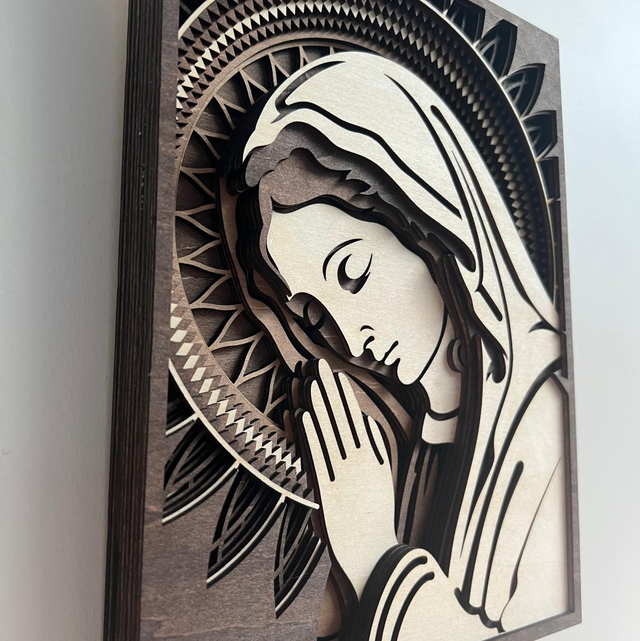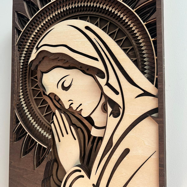 Magnifique cadre représentant la Vierge Marie, réalisé en bois avec un élégant dégradé de marron qui apporte douceur et chaleur à l’ensemble.
